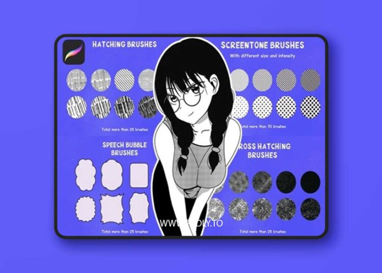 Contains 200+ set of procreate brushes and manga canvas template including g-pen brush, kabura brush, maru brush, screentone, speech bubbles, hatching, cross-hatching halftone to help you make manga or comic a lot easier in Procreate.