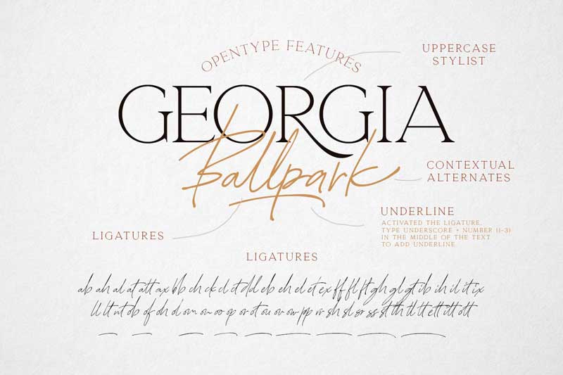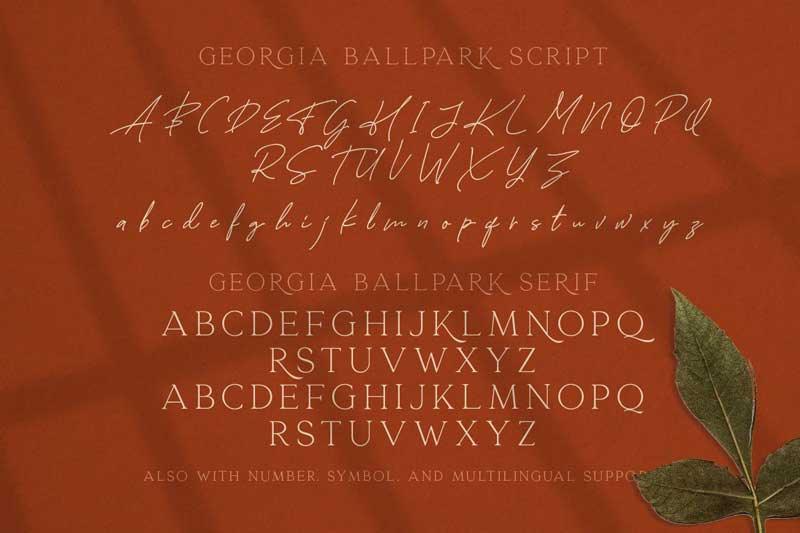 Georgia Ballpark Font Duo is the best combination of modern serif and signature script font. Georgia Ballpark Font comes with free handwriting script and delicate modern serif style. This font also supports multilingual, number and symbol, end swash and many ligatures. you can use this font for various purposes like logo, magazine, wedding and greeting cards.