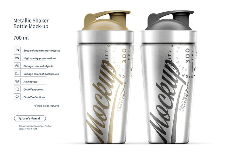 Introducing the creativemarket Two Metallic Shaker Bottle Mock-up 4504308. A great way for any creative person to show off their work. In this Adobe Photoshop file, you can create your own fully customizable packaging project where you can display your own brand.